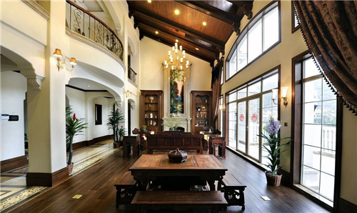 純正的中式風格比較適合大空間的裝飾,在小空間內反而給人壓抑的感覺。這是一款中式別墅客廳裝修,實木材質的使用讓整個空間更加的親近自然,古香古色的中式四方桌很好的展現著中國文化的博大精深,傾斜的吊頂與整個空間形成了一個完美呼應。