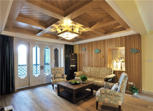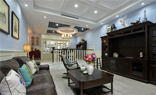 這是一款美式鄉村風格的客廳裝修,整個空間不僅顯得豪放大氣,同時彰顯著濃郁的浪漫氣息,客廳吊頂采用白色的石膏線打造,流暢干練的線條塑造出一個個方形的小格空間,是整個空間顯得極具層次感。