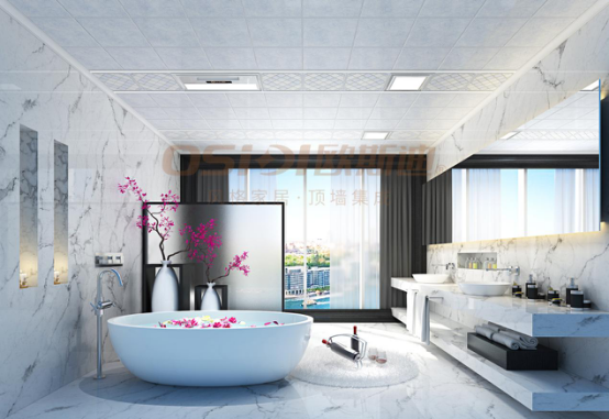 1.漂亮“頂”:區別于以往廚衛吊頂上生硬地安裝浴霸或換氣扇或照明燈后的效果,集成吊頂安裝完畢后看到的不再是生硬組合,而是美觀協調的頂部造型。